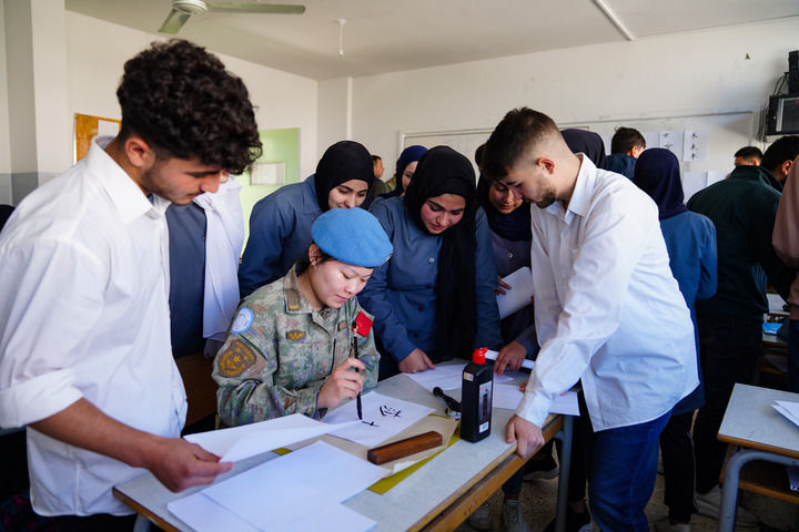 2023年4月3日◈ღღღ★,中国赴黎巴嫩维和多功能工兵分队维和女兵韦薇在贝鲁特拉赫曼·尤努斯中学用中文书写学生名字◈ღღღ★。新华社发(李竹林摄)
